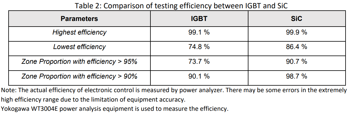 Our SiC power module is incorporating ROHM’s 4th generation 750V SiC chips as well as ROHM’s corresponding isolated gate driver. The efficiency testing of our in-house developed SiC motor control unit (MCU) is performed on a permanent-magnet synchronous motor. Comparing the essential indicators of an IGBT MCU with our SiC MCU, it becomes obvious that not only the high-efficiency range increased but also the peak power output reached higher maximum levels. This derived from the low conduction losses of unipolar power devices, in particular at light load operation. Additionally, the low switching losses of silicon carbide, given the unique wide bandgap material qualities, is another factor.